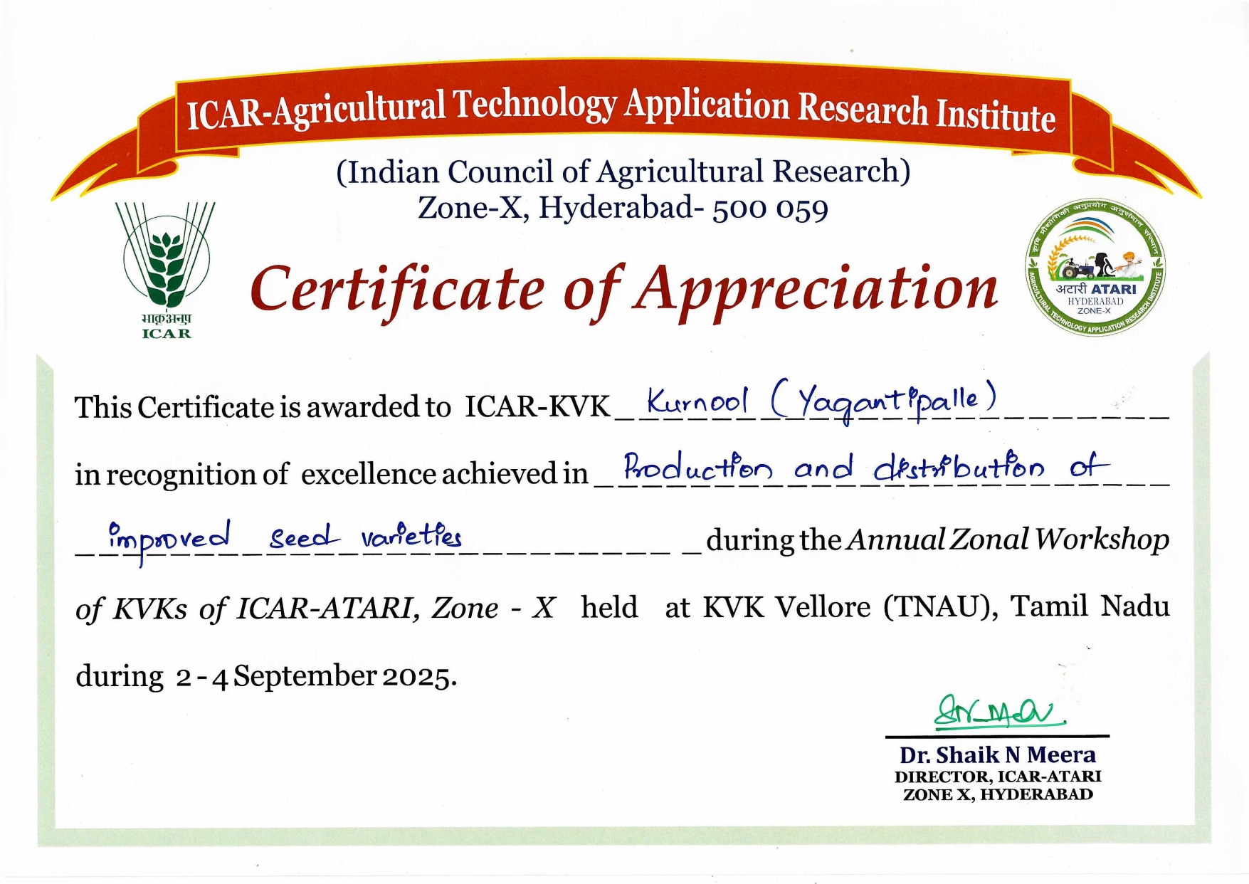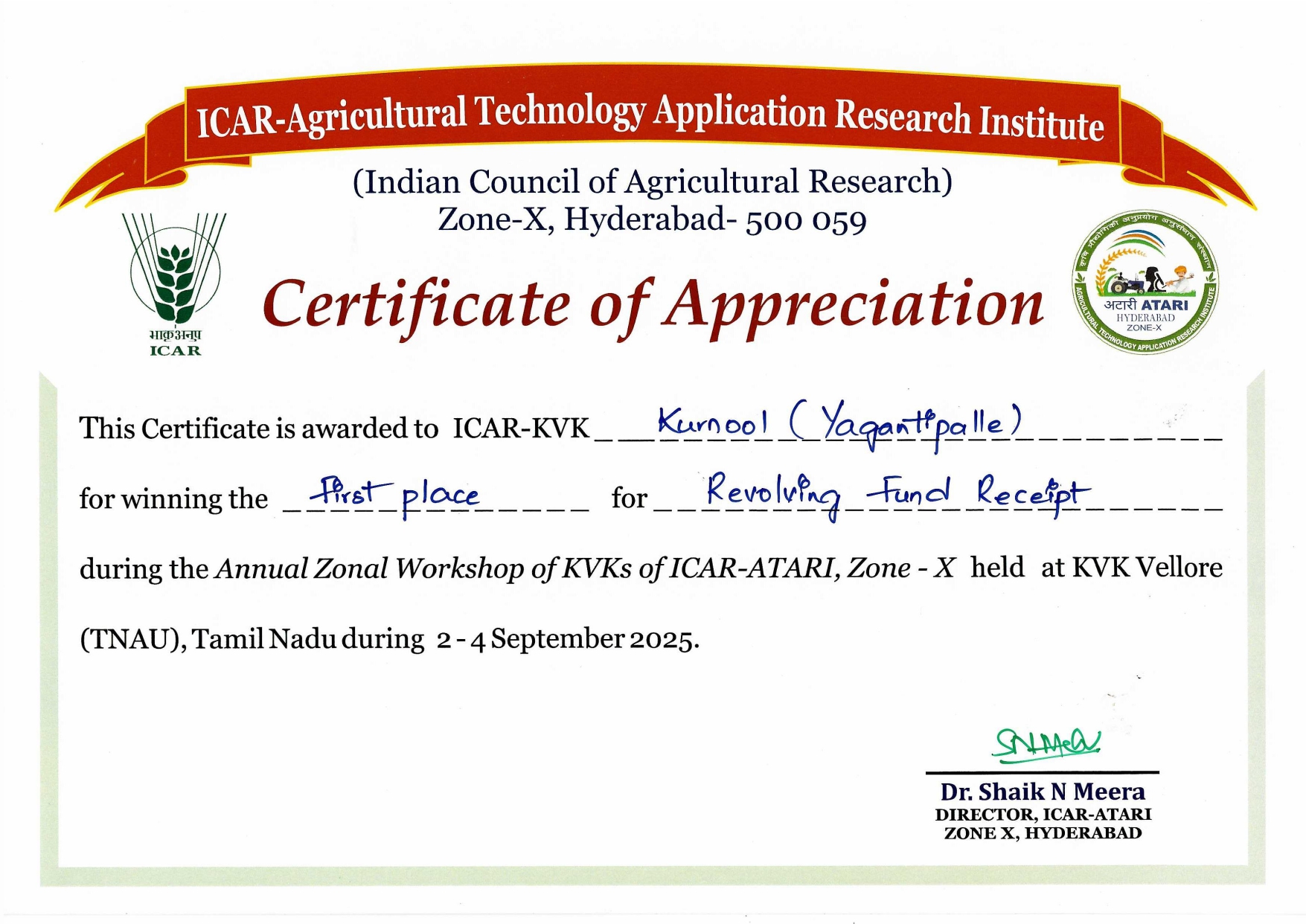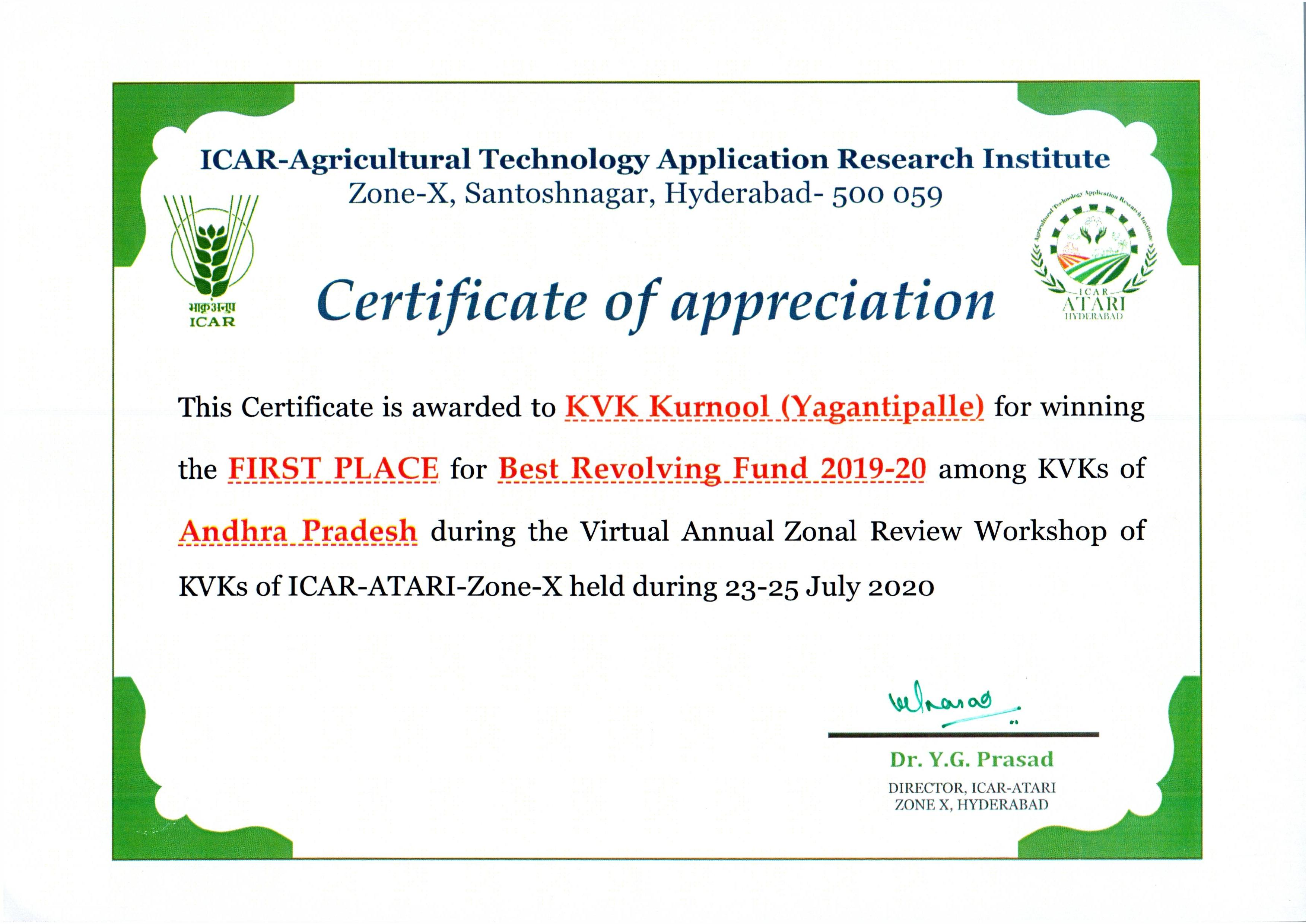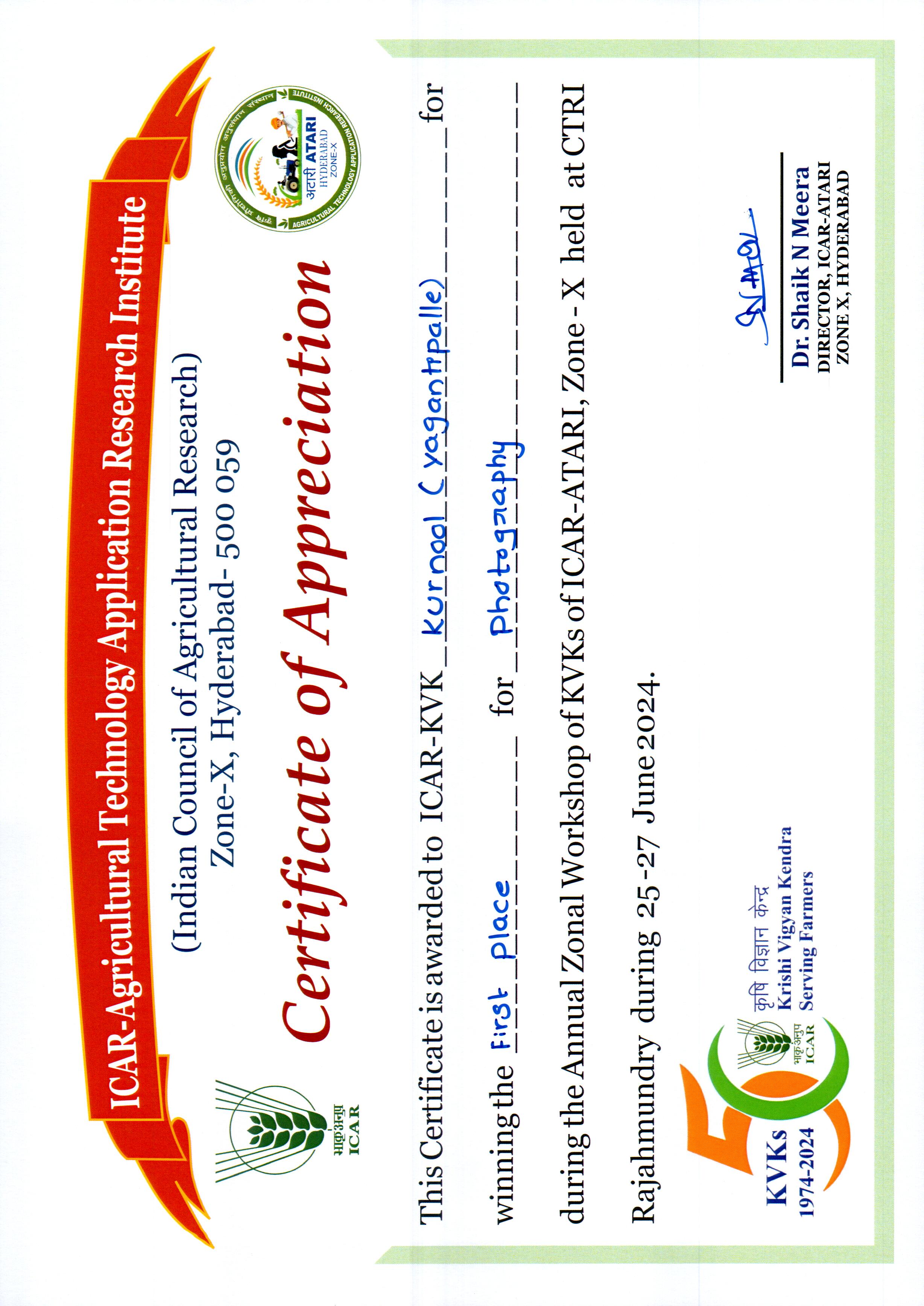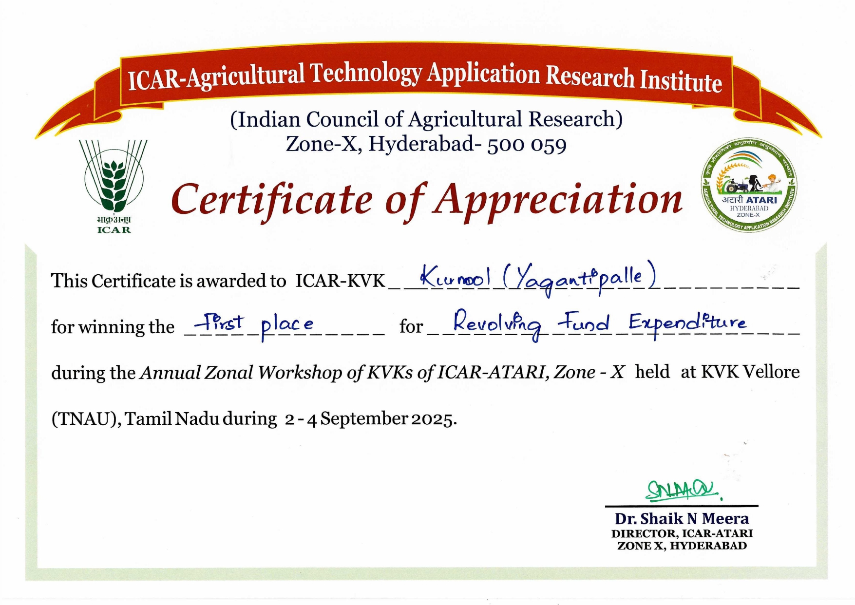 Overall Best Performing KVK-2023 of ICAR-ATARI, Zone-X, Hyderabad